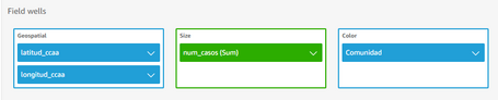 Crear un elemento de tipo visual es bastante sencillo, en la parte superior de la pantalla nos aparecerá una serie de cajas en las que tendremos que incluir los campos que queremos mostrar, dependiendo del tipo de gráfico. Por ejemplo, para visualizar el mapa tenemos que incluir los datos de latitud y longitud de cada uno de los elementos: