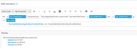 Una vez seleccionado el tipo de algoritmo que se quiere implementar, se muestra una pantalla en la que se puede editar la narrativa para adaptarla libremente. En el ejemplo que hemos realizado mostrado en la siguiente imagen, se muestra un Top 3 de las Comunidades Autónomas con mayor número de casos, y como se observa en la imagen, se puede modificar la forma en la que presentamos la información, permitiendo incluir enlaces o imágenes.