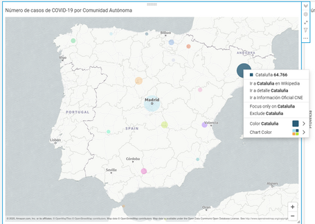 En este caso, vemos dos acciones adicionales. La primera “Ir a Cataluña en Wikipedia”, nos llevaría a un enlace externo de la información de Cataluña, mientras que la segunda “Ir a detalle Cataluña”, nos llevaría a otra parte del dashboard: