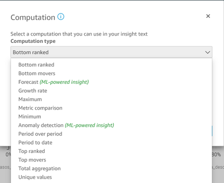 Aunque es una funcionalidad a priori más compleja que el resto de visualizaciones, QuickSight realiza una serie de sugerencias como las mostradas en la imagen anterior en función de nuestros datos, ayudándonos a sacar Insights fácilmente.