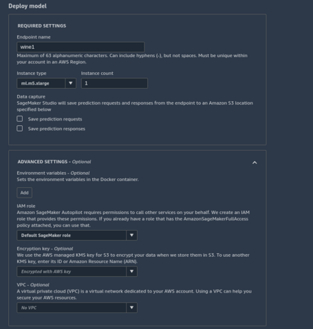 Finalmente, ya sea desde el notebook o desde el listado de modelos candidatos,podemos desplegar cualquiera de ellos sobre Sagemaker de una forma bastante sencilla. Podremos elegir sobre qué tipo de instancia se ejecutará nuestro modelo contenerizado y configurar algunos parámetros avanzados como la VPC o pasarle variables de entorno a nuestro contenedor.