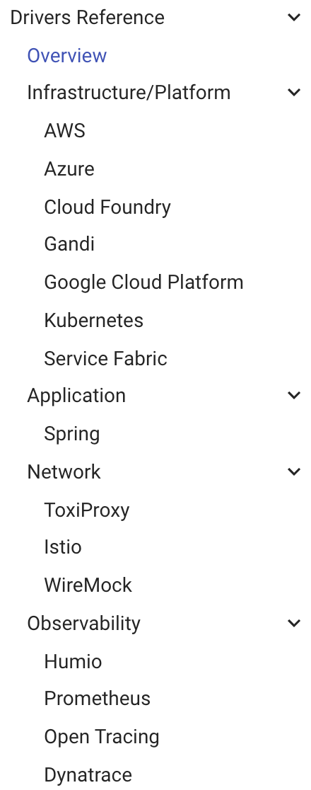 Como podemos observar están incluidos los 3 principales Cloud Provider del mercado y kubernetes. También tenemos drivers para ejecutar experimentos a nivel de framework de desarrollo, como Spring, así como software de Networking como Istio e incluso plataformas de observabilidad.