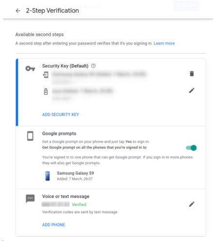 Actualmente, incluso las cuentas públicas de Google nos ofrecen la opción de añadir el doble factor con estas opciones: