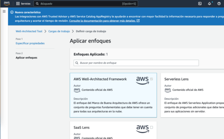 En ella podemos dar de alta los datos de la carga de trabajo/arquitectura que queremos evaluar y un conjunto de listas de comprobación predefinidas que podemos aplicar. Entre estas listas encontramos el propio AWS Well-Architected Framework o listas más específicas aplicadas a soluciones Serverless y SaaS.