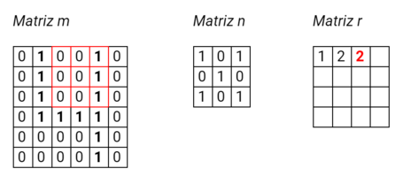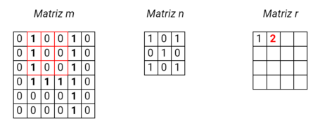 Simplificando, debemos deslizar la matriz filtro sobre la matriz original, por lo que la aplicación de la convolución de las dos matrices (la aplicación del filtro) se aplicaría de la siguiente forma: