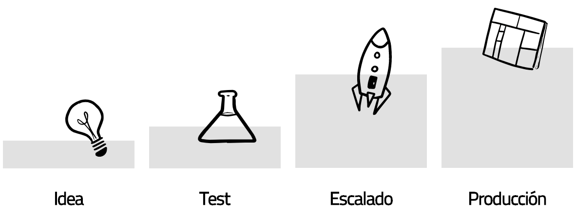 Definimos cuatro etapas en nuestro flujo: ideación, test, escalado y producción que nos permiten fallar ‘rápido’ pero barato en la evaluación de las ideas.