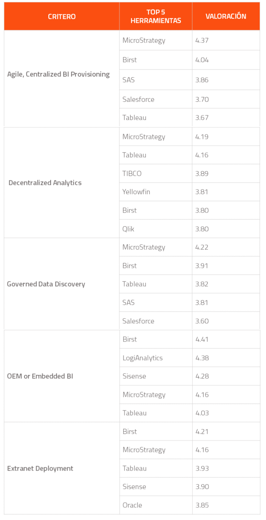 Para ello, seguiremos los cinco criterios de la consultora (Agile Centralized BI Provisioning, Decentralized Analytics, Governed Data Discovery, OEM or Embedded BI y Extranet Deployment) que atribuyen una puntuación a cada una de las herramientas y de las cientos de reseñas efectuadas por parte de usuarios, agencias o empresas de datos.