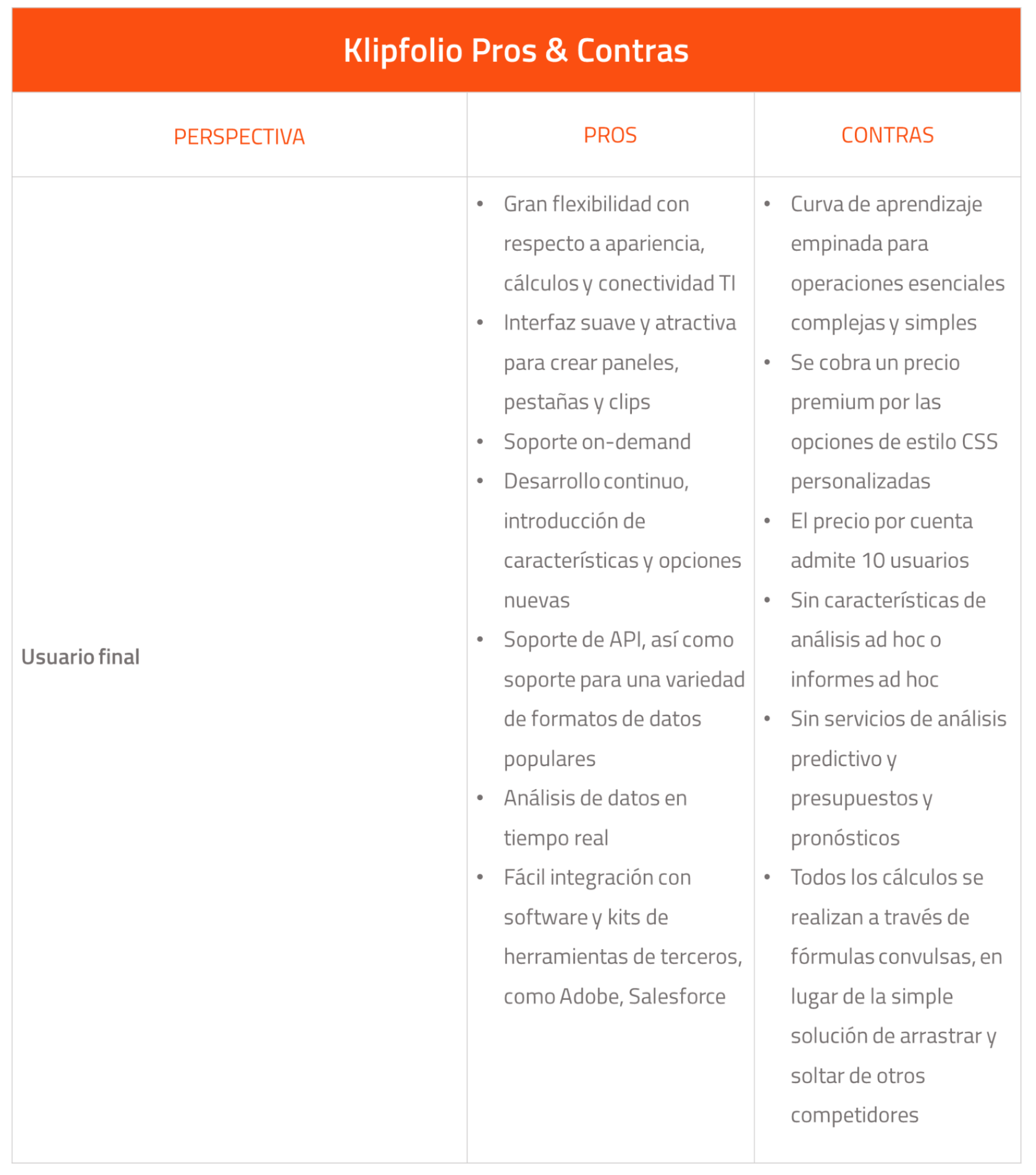 Klipfolio apuesta principalmente por su oferta en la nube hoy, mientras que también ofrece una opción de solución de on-premises. Klipfolio Dashboard (como SaaS) se distribuye utilizando una política de precios de usuarios por mes, con algunas pequeñas variaciones del total dependiendo del volumen y los compromisos de tiempo.