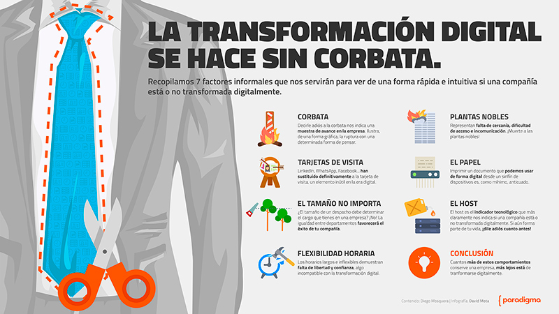 Pero las empresas no solo están formadas de relaciones formales, también hay una serie de indicadores informales, muy fáciles de identificar, que nos ayudan a predecir si una compañía está o no preparada para llevar a cabo la transformación digital.