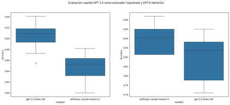 Observamos que evaluar un LLM con el mismo LLM puede causar un sesgo en favor de ese LLM. Esto lo vimos concretamente con GPT 3.5 Turbo, que lo empleamos para realizar una comparación de este modelo con Claude Instant. Se observaba una tendencia clara que indicaba que GPT 3.5 Turbo daba mejores respuestas, pero al evaluar de forma manual vimos que no era necesariamente cierto. Tras observar esto, cambiamos como modelo evaluador a GPT-4 que, además, es un modelo más inteligente, dando lugar este LLM a más resultados en favor de Claude Instant que GPT 3.5 Turbo. En la figura de a continuación, se muestra esa diferencia en la métrica denominada como accuracy, viendo cómo usando GPT 3.5 Turbo (izquierda) se favorecía de forma bastante clara a lo generado por ese mismo LLM mientras que, evaluando con GPT-4 (derecha), observamos el efecto contrario.