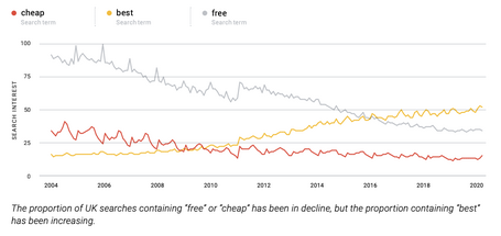La gráfica 1.1 (Informe Decoding Decisions) analiza las búsquedas relacionadas con compras en Google de las palabras “barato”, “mejor” y “gratis” durante los últimos 16 años en el Reino Unido. Podemos observar el crecimiento de la utilización del adjetivo “mejor” hasta convertirse en un término más buscado que “barato” o que incluso “gratis”.